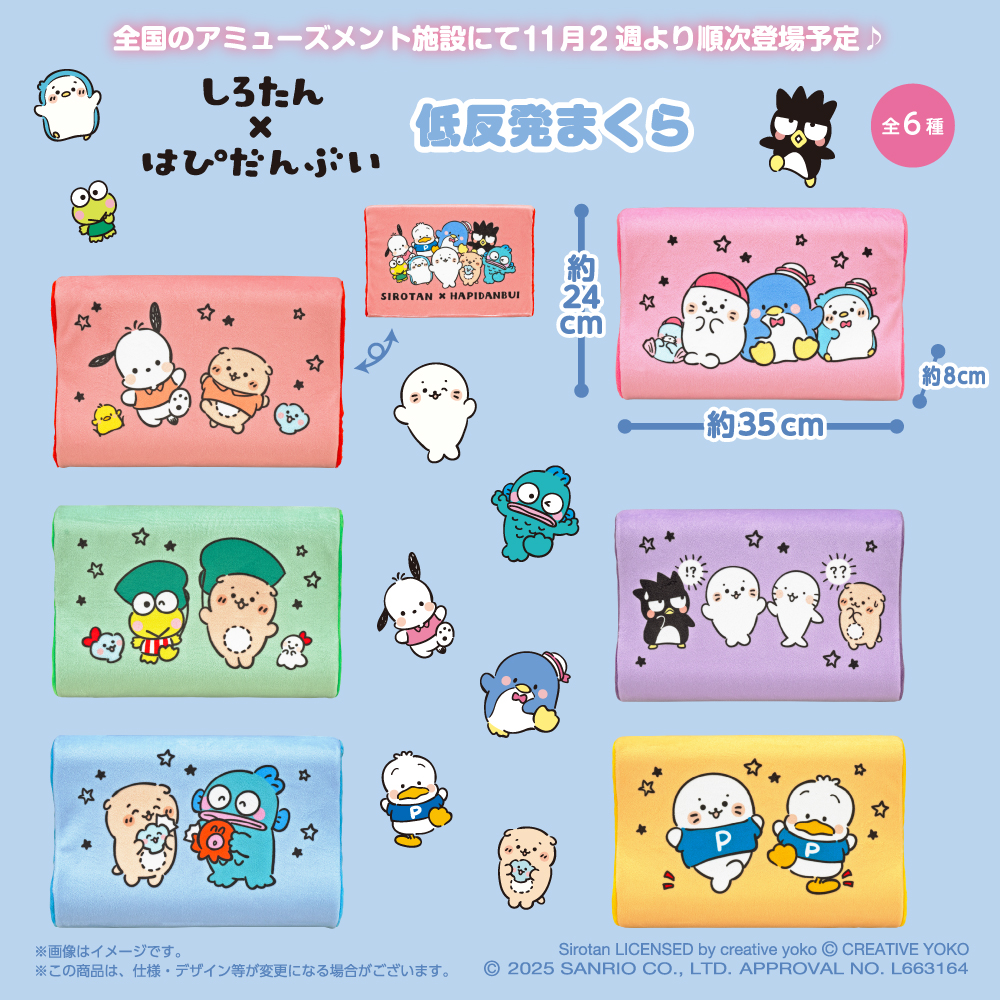 商品名:しろたん×はぴだんぶい 低反発まくら種類:全6種類サイズ:横約35cm×縦約24cm×奥行8cm発売日:2025年11月2週より順次取扱場所:全国のアミューズメント施設▼取扱店舗一覧はこちら▼エイコープライズ公式サイト発売元:(株)エイコー(https://www.e-eikoh.co.jp)