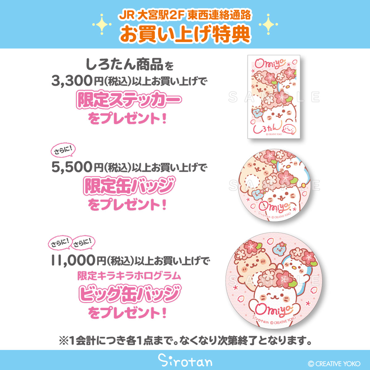 しろたん商品3,300円(税込)以上ご購入で限定ステッカー、5,500円(税込)以上ご購入で